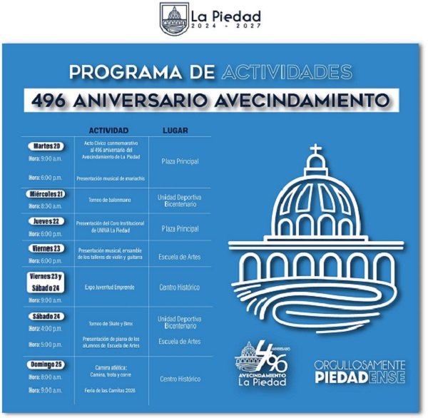Con motivo del 496 aniversario de La Piedad, el Gobierno Municipal, encabezado por el presidente Samuel Hidalgo, invita a las familias piedadenses y a la ciudadanía en general a participar en las actividades conmemorativas que se han preparado para celebrar esta fecha tan significativa en la historia del municipio.
